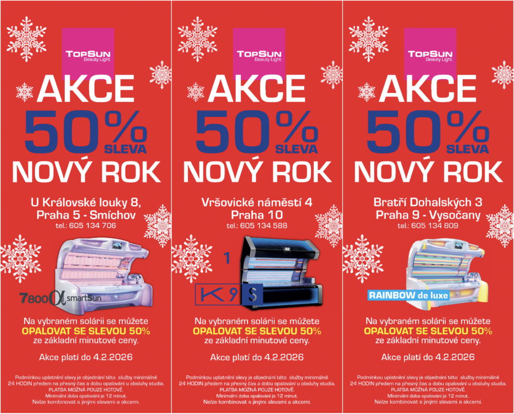 Vybraná solária nyní se slevou 50 % na provozovnách Praha 5 – Smíchov, Praha 10 – Vršovice a Praha 9 – Vysočany.